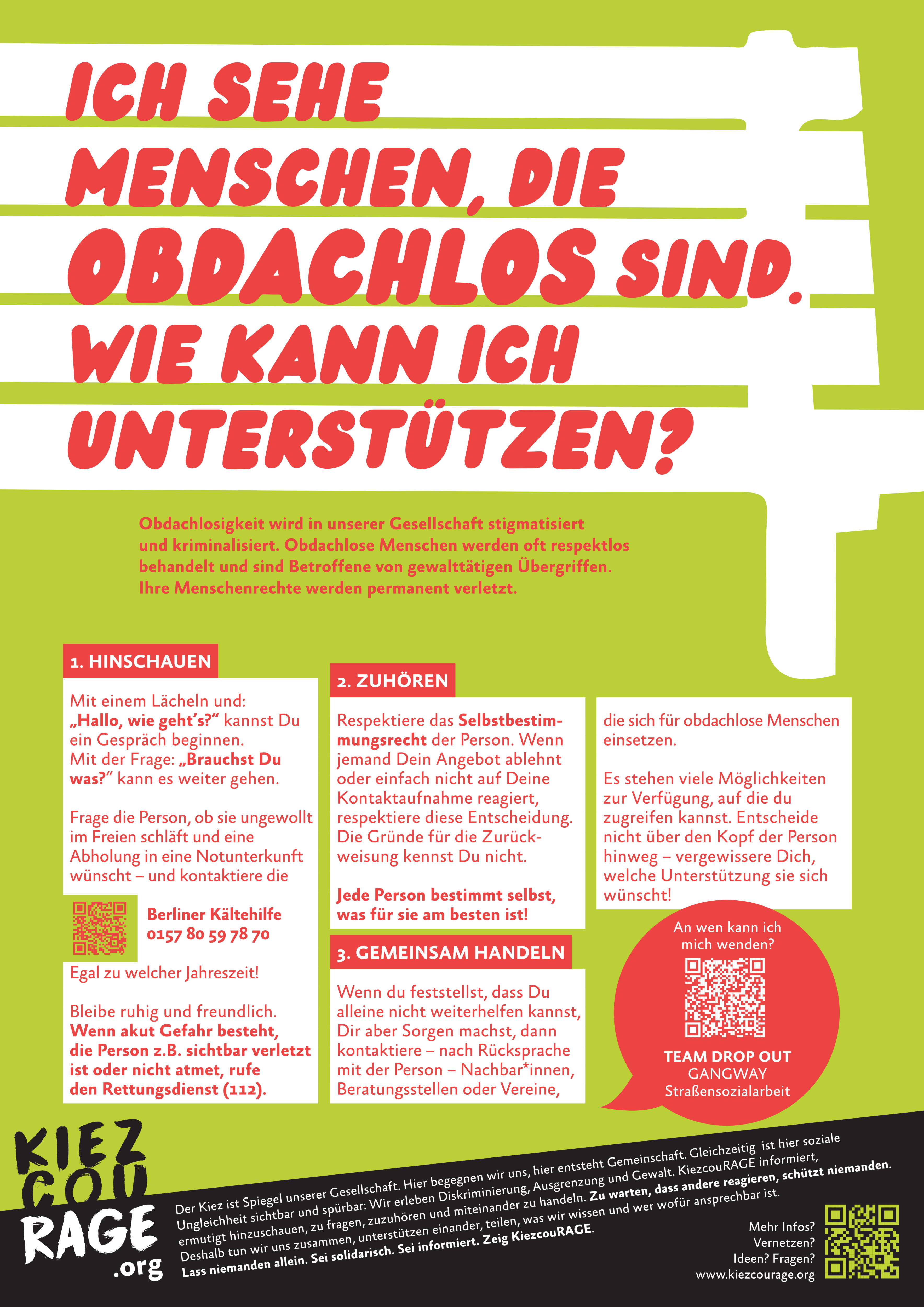 Wenn du feststellst, dass Du alleine nicht weiterhelfen kannst, Dir aber Sorgen machst, dann kontaktiere – nach Rücksprache mit der Person – Nachbar*innen, Beratungsstellen oder Vereine, die sich für obdachlose Menschen einsetzen.